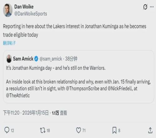 由于国王报价没有吸引力,勇士正在帮库明加寻找新下家。1月15日晚,据NBA记者Sam Amick和Dan Woike联合报道,湖人对交易得到库明加有实质性的兴趣。勇士已经一个多月没有联系篮网,交易小波特的计划暂时搁置。