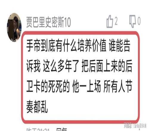 “手帝打成这样,还用,就不能上虎子何大牙?杨鸣水平呀”;“手帝到底有什么培养价值 谁能告诉我 这么多年了 把后面上来的后卫卡的死死的 他一上场 所有人节奏都乱”……